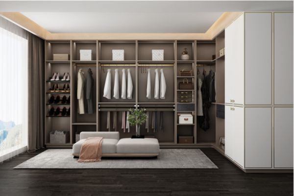 “未央”衣帽间包含开放式挂衣区、存储区、展示区和沙发区,空间层次分明,满足日常挂衣和存储需求。一目了然的衣帽间,拿取衣物无需开门,随手取放,清晰明了的男女分区,互不干扰,让生活井井有条。而中间的沙发区,则仿若点睛之笔般为整个衣帽间注入自然的生命力,生动而充满了呼吸感。