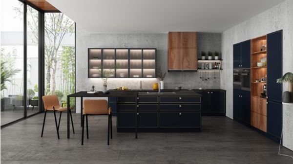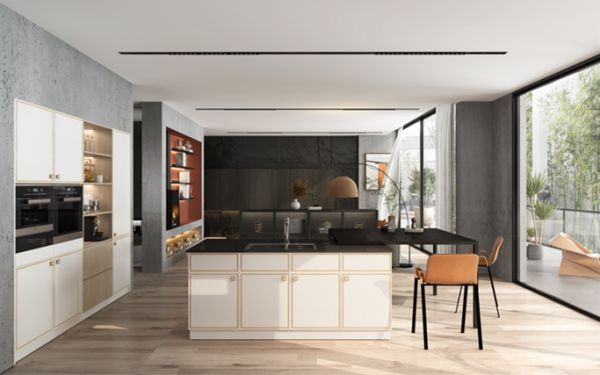 “未央”合理的布局使房间看上去宽敞通透、舒适自然。选用大理石背墙,油污易清理,耐磨耐刮,耐高温,美观性高。长虹玻璃柜通透明亮,增加空间的质感。搭配金属层板,兼具实用性与颜值。设计师将木质材料的使用作为空间设计的重中之重。原木色和黑胡桃深色,一深一浅的木质调,仿佛水墨或浓或淡的晕染,为素白的空间带来更多层次感。餐边区、洗涤区和便餐区分区明确又不刻板。遵从国风宽敞简练的内设传统,“未央”将厨房空间扩大,增加餐厨的收纳空间,每个空间看似独立却又相互串联。看似彼此矛盾,却也产生恰到好处的融合之美。独立使用的时候可以保证功能分区,但当他们合并在一起,生活也就有了重叠。当晨光打在玻璃柜上时,爸爸在折射的五彩斑斓的阳光中为家人准备早餐。当厨房阵阵飘香后,妈妈终于把小朋友唤醒换好衣服,手牵手来到摆放早餐的吧台,父母和睡眼惺忪的小朋友一起享受营养美味的早餐时刻。午休后,一家人一起烘焙一个甜品或是一起准备晚饭,一边感受都市中独有的宁静,告别外界的纷扰,清闲度日,一边看着小朋友嘻嘻哈哈玩耍,正所谓“人间烟火气,更抚凡人心”,体会生活的温暖和陪伴。