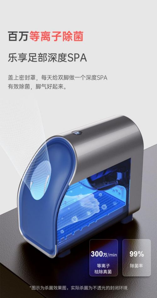 魔创干脚机采用等离子除菌技术,可每分钟释放300W等离子,除菌率高达99.9%,可作用于脚部、房间,作用环境需密闭。