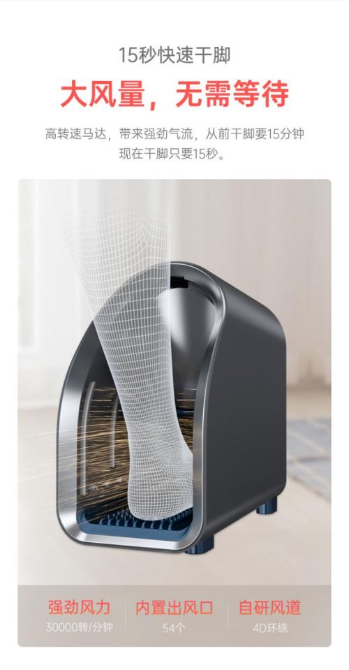 魔创干脚机采用魔创品牌原创风道专利技术,设计了54个出风口,可实现360°全方位立体出风,快速吹干脚部水珠,让脚部更干爽。