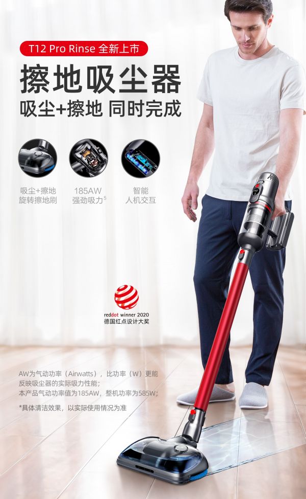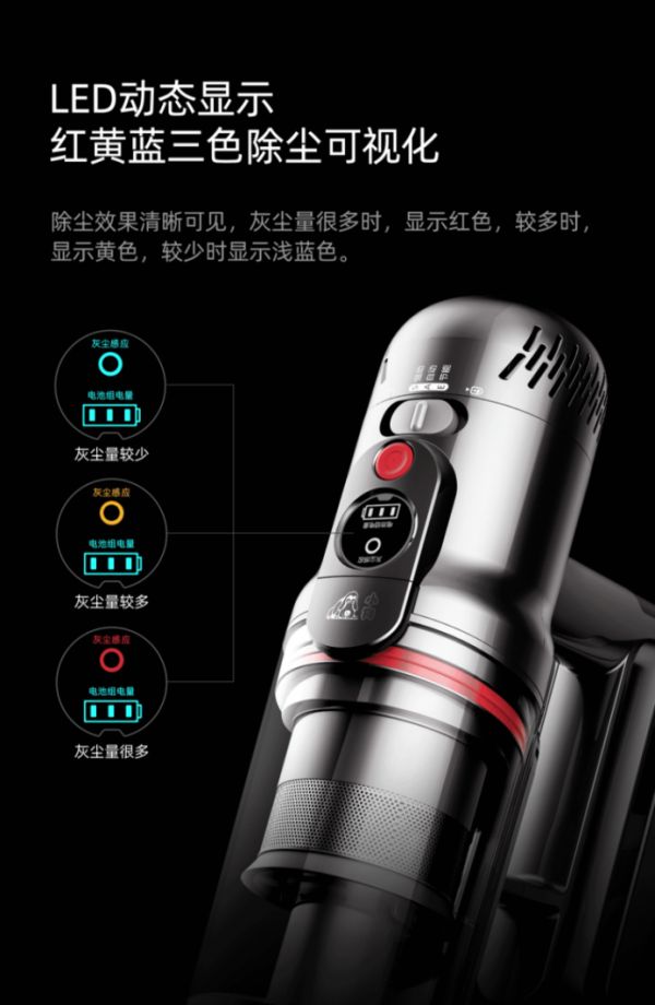 小狗T12 Pro Rinse擦地吸尘器整机吸入功率达到185AW,是小狗无线吸尘器迄今为止吸力最强款,稳居现阶段国内无线手持吸尘器市场中第一梯队。智能数字化除尘系统可以通过红外线分析气流中的微尘数量,在自动档清洁模式下自动调节功率大小,灰尘越多吸力越强;LED动态显示屏通过红黄蓝三色变化实现除尘可视化,用户第一时间可掌握清洁区域的脏污程度。