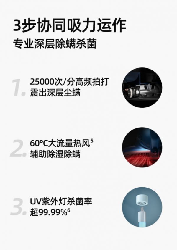 小狗MC05应用了小狗旗舰系列才配置的智能感应除尘系统,可高精度、连续检测气流中的微尘及过敏原数量,红黄蓝指示灯可以实时显示清洁程度,除尘除螨效果“看得见”;电动滚刷25000次/分大面积、高幅度拍打,可以震出深层藏匿的灰尘、螨虫、皮屑等,120AW的强大吸力轻松吸除各种隐藏的脏污,60℃大流量热风辅助除湿除螨,UV紫外线灯杀菌率超99.99%,螨虫尘污“吸得尽”;它还拥有精钢滤网+H12级HEPA+排风海绵,实现整机多重过滤,能够拦截99.95%小至0.3微米的螨虫及微尘,二次污染“拦得住”。除了性能突出,这款除螨仪还具备“高颜值”,它应用双层喷涂工艺+触感漆,可为消费者带来工业美学享受。