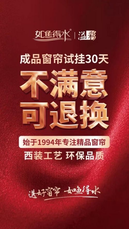 三、持续输出特色化贴心服务,2020年,如鱼得水“客户买窗帘十怕,如鱼得水十诺”和“成品窗帘试挂,30天内不满意可退换”,一经推出便受到了市场的热烈反响。消费者在购买窗帘时,除了质量最看重的就是体验和服务,如鱼得水的“试挂”让买窗帘像买衣服一样简单,无需担心任何风险,30天内不满意可以免费退换。