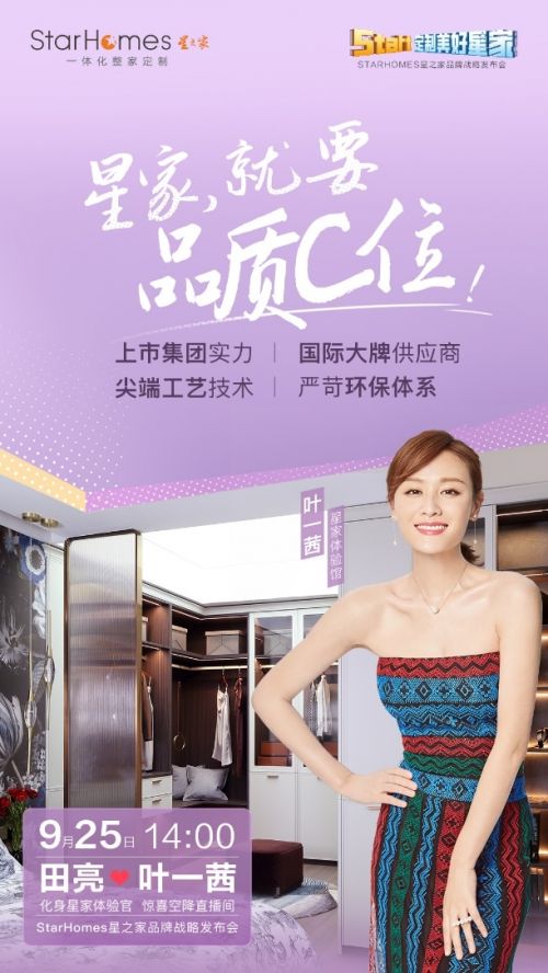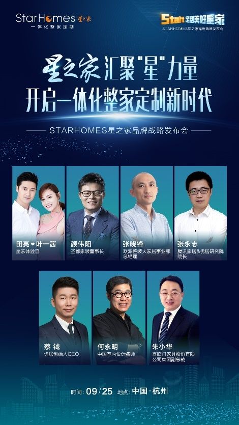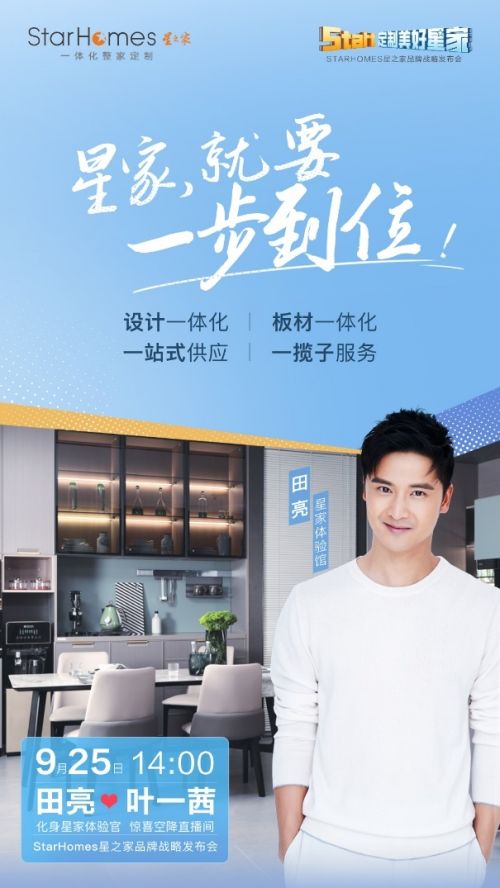 为进一步完善供应链体系、优化产业布局、为消费者提供更具审美价值和体验感的定制家装产品和服务,欧派家居集团旗下全新品牌“StarHomes星之家” 即将于9月25日,在杭州举行品牌战略发布会,冠军夫妻田亮、叶一茜强势助阵,众多行业领导嘉宾强势加盟、权威主流媒体云集杭州,共同见证StarHomes星之家的首秀亮相,开启家装新生态,引领一体化整家定制新时代!