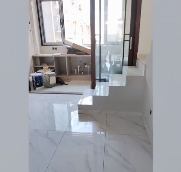 从视频上可以看到,屋内的地砖都被铺好了,楼梯阶也被贴上木板,墙壁也都粉刷一新,每个房间的门框都已经安装好,就连屋内的衣柜也都放置进来,屋内还坐着几名男子,其中一名男子正在打电话联系。通过楼道,走到隔壁邻居的屋内。