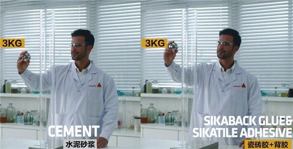 左边是用水泥砂浆铺贴的瓷砖,右边是使用西卡瓷砖胶+西卡背胶规范铺贴的瓷砖,可以看到经金属球1米下坠打砸后,左边的瓷砖碎了一地;而右边的瓷砖,依旧好好地。