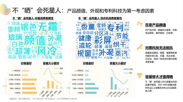对于品质生活中的核心硬件——冰箱和洗衣机,高颜值才值得被晒在社交平台。《白皮书》数据显示,“颜值”、“彩屏”分别是最突出的冰箱、洗衣机需求属性,在颜色选择方面,银色和白色关注度更高。要想在朋友圈晒照大赛一举夺魁,光有颜值还不够,有黑科技的助攻才能赢得更轻松。《白皮书》显示,“无霜”、“风冷”是冰箱的高频功能诉求,“分区洗”、“洗烘一体”等科技需求度显著提升。