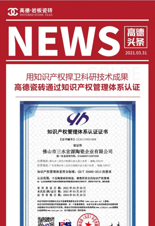 近日,经权威机构审核,高德瓷砖所属企业宏源陶瓷集团顺利通过知识产权管理体系认证,意味着高德瓷砖在研发技术储备和知识产权管理上取得重大成果。