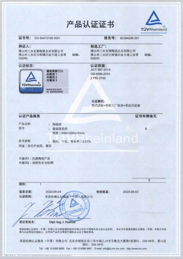 目前,高德瓷砖在知识产权领域取得了卓越的成就,专利、商标、著作权和认证体系全面开花,相继通过了ISO9001质量管理体系认证、ISO14001环境管理体系认证、ISO45001职业健康管理体系认证。同时,在产品研发方面也获得重大突破,高德瓷砖独家研发的健康能量砖产品,先后通过德国莱茵TÜV“抗菌陶瓷制品认证”、“HiH健康标识”认证、中国绿色产品认证,并荣获“健康地产推荐产品证书”。