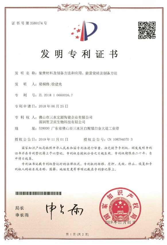 ▲ 高德·健康能量砖发明专利证书
