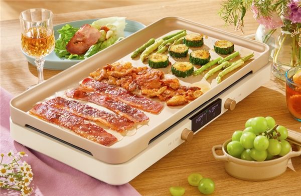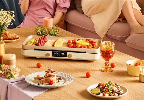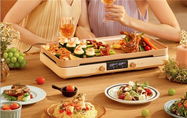 其次,在注重用户需求的同时,荣事达没有落下的产品技术的研发与革新的投入。这款畅嗨盘采用进口直流无刷风机、稳定性强,几乎零噪音,确保产品能够适合摆上餐桌使用,不影响聚嗨氛围;1500℃一体成型的微晶面板确保产品能够2秒均衡速热,配合三重精准控温系统实现全面板精准控温,将热效率提升了40%,更重要的是,精准的温度控制能够帮助用户在烧烤时将温度控制在起烟点之下,轻油少烟更健康。超大面积烤盘采用的是自主研发的1000℃高温一体无缝压铸、进口双层水性材质小金盘,材质安全无毒、受热导热均匀,更适合煎烤、能够实现不沾,极易清洗。