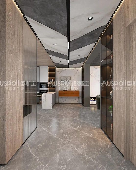 深褐色墙板营造沉静气氛,深色的光合木墙板能衬托吊顶的白色、凸显整体空间的高级质感。