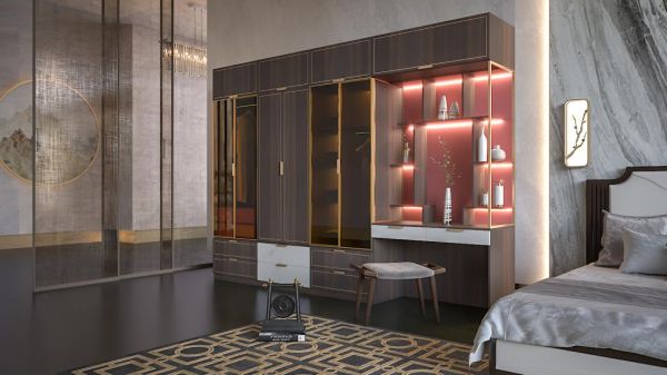 如何将新中式和轻奢实现无缝衔接和融合,是考验当前定制家居企业设计和生产研发实力的关键。2021年,定制市场涌现出诸多出众的产品设计,但鑫迪家居另辟蹊径,摆脱传统中式纯实木的设计理念,将木纹与金属相结合,将现代轻奢元素代入,打造了现代轻奢新中式系列产品“绝奢·赤”,以用材的高配满足生活的奢配,用大气雅致的色彩凝造出知性浪漫,在众多设计中脱颖而出,在市场上掀起一股现代轻奢新中式的风潮。