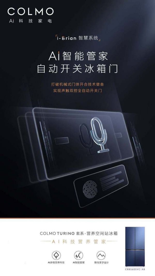 美的高端冰箱COLMO TURING套系·营养空间站冰箱,是行业首台自带人工智脑i-Brain智慧系统,以AI微传感检测、AI人工神经网络算法、AI智能自主控制三大核心技术,打造多方位智慧科技平台,AI声触双控全自动开关门,AI语音交互、AI全屋互联、AI自动保修,TURING,让AI走进厨房,实现真正的“人机交互”。
