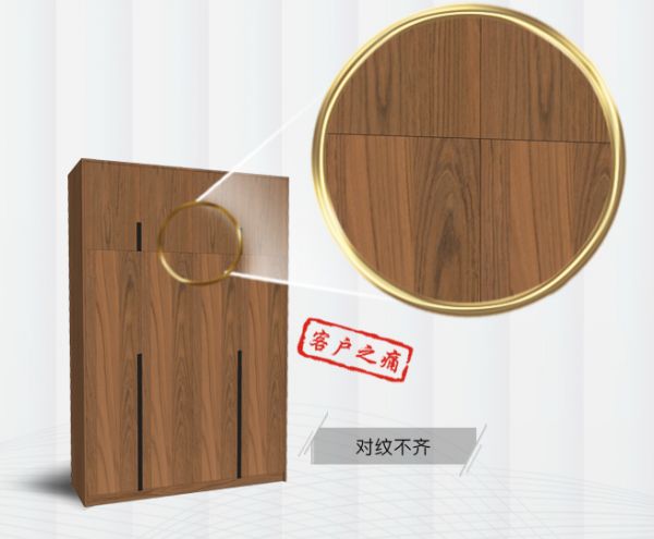 定制木纹家具(实木皮、仿木纹)纹理整齐、统一很重要!一个面各部件之间,面与面之间,纹理不齐,导致家具颜值大跌,甚至影响全房整体美观......