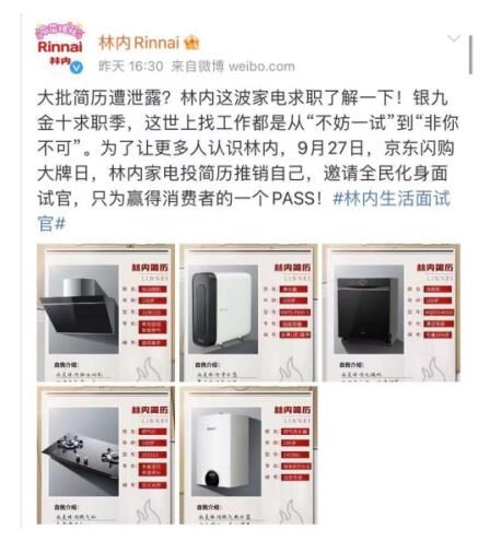 现代社会生活节奏快,离职、面试每天都在发生,选择一份职业,需要进行长远规划,而非一时兴起。选购家电也一样,消费者花费大量时间奔波往返,只为找到合适自己的产品。这是一个消费者主权的时代,为精准触达每一位消费者心理,在此次京东闪购日活动中,林内提出“做生活的面试官”,发起一场家电求职计划。通过汇总优势的家电简历创意形式,充分调动消费者的好奇心理,延展微博热搜话题度,同时也满足消费者青睐的沉浸式体验需求,从而更深度了解林内品牌理念。基于对产品赋能的信心,林内将产品优势与求职建立联结点,激起消费者的心智共鸣,建立消费者对品牌的好感,塑造年轻化的品牌形象。