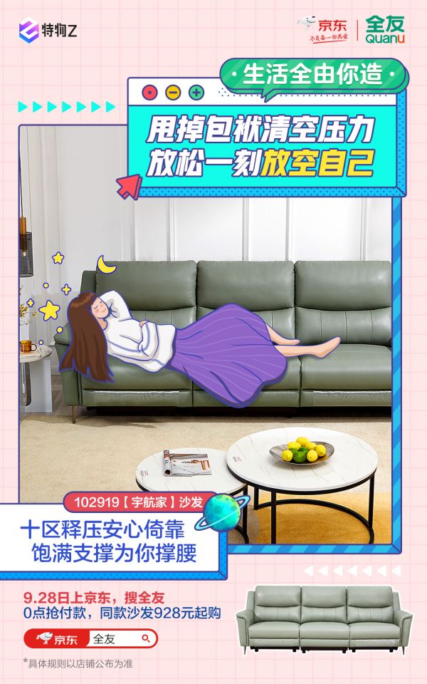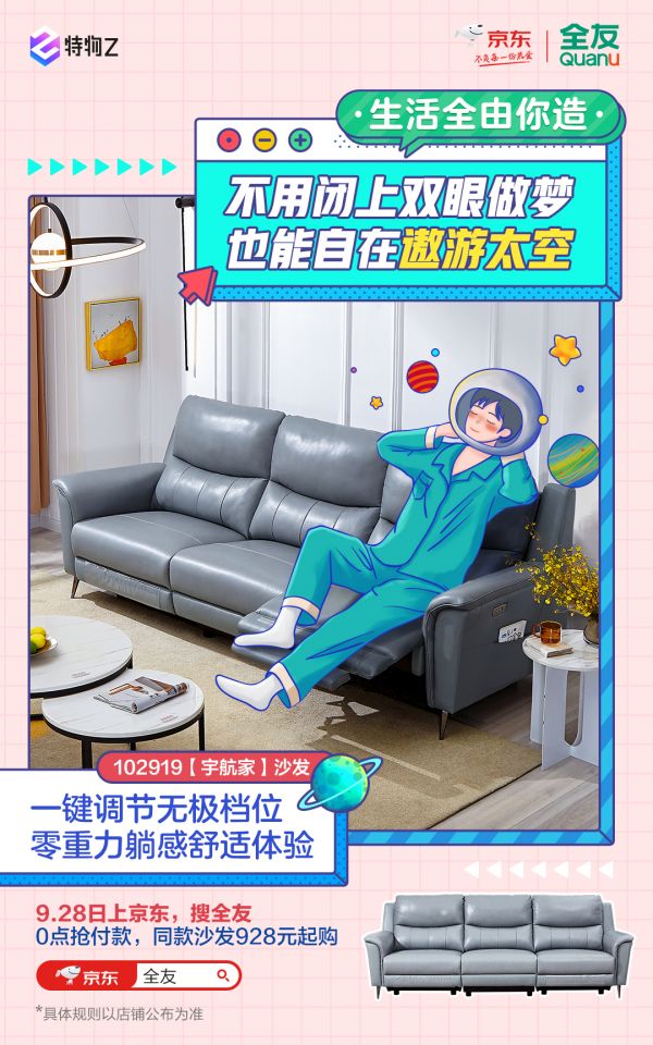 随着Z世代逐渐成为消费主力,“年轻化”已成为品牌创新升级的重要方向之一。为满足年轻人理想之家的向往与需求,全友开启“生活改造计划”,除了在各大线上平台开展了一系列丰富有趣的活动,引发了在年轻圈层中巨大的讨论声量外,在电商购物平台也为年轻人们准备了诸多惊喜。正值京东“特物Z”活动期间,全友京东官方旗舰店推出花式宠粉活动,以多样福利与各类超值家居爆款产品,为年轻人打造理想之家加油助力。