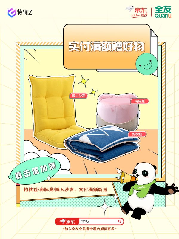 同时,只要在活动期间下单达到指定金额,就能获赠懒人沙发、网红海豚凳等超值好物,并且在活动期间加入全友京东旗舰店会员即可获得专属大额优惠券,用更低价格将心仪家具带回家。