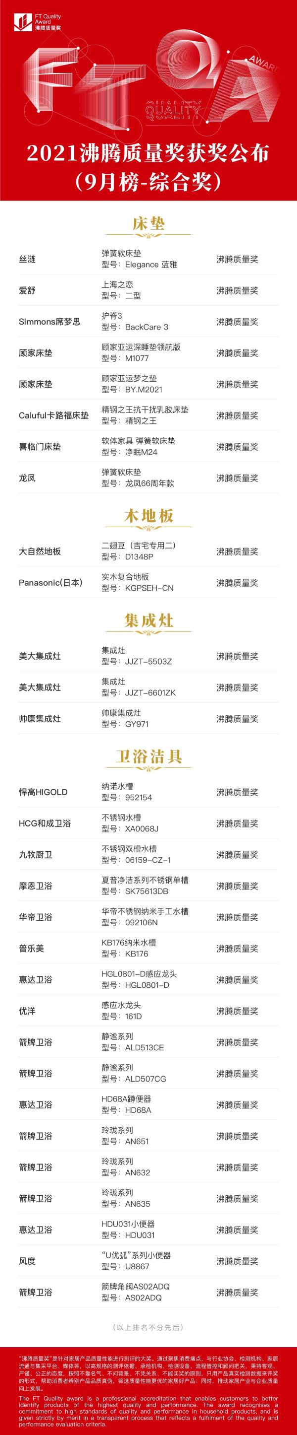9月是“中国质量月”。以质量为名,为品质做舟,赋能品牌形象、销量双丰收。在以“为美好生活甄选更优产品”为使命,秉持“精工品质 用数据说话”原则的“家居质量奥斯卡大奖”——沸腾质量奖,重磅揭晓了2021年度9月获奖榜单。