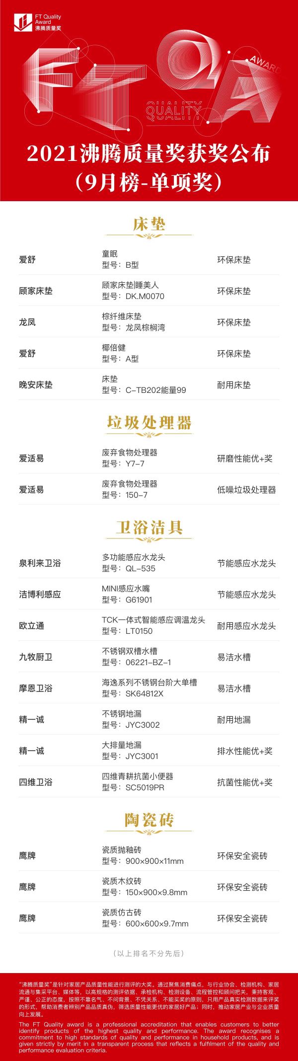 本期9月沸腾质量单项奖获奖榜单中,共揭晓床垫、垃圾处理器、卫浴洁具、陶瓷砖四个品类18款产品获奖结果,获奖品牌包括:爱舒、顾家床垫、龙凤床垫、晚安床垫、爱适易、泉利来卫浴、洁博利感应、欧立通、九牧厨卫、摩恩卫浴、精一诚、四维卫浴、鹰牌。