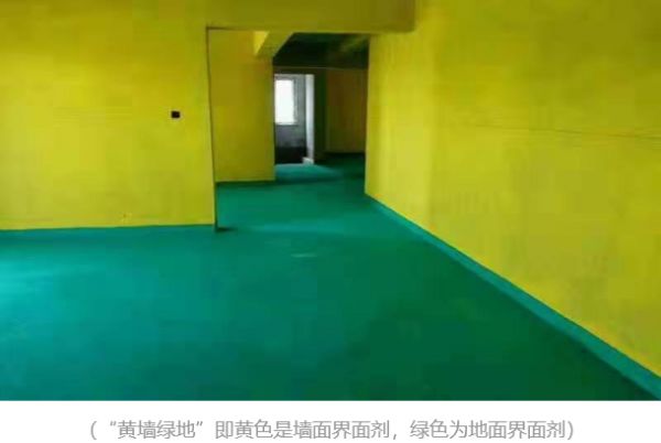 在装修时,为了很清楚发现墙面是否有漏涂、少涂,防止因为漏涂而影响装修质量,墙面界面剂涂刷过后的墙面为黄色,地面界面剂涂刷过后的地面是绿色。
