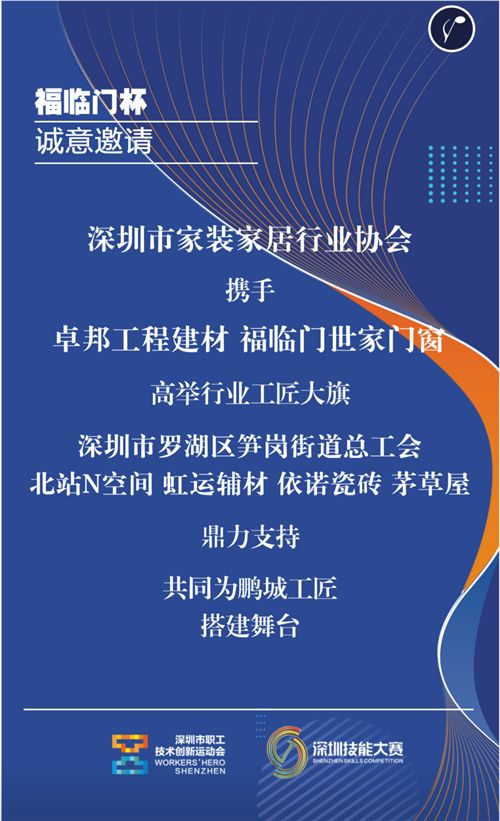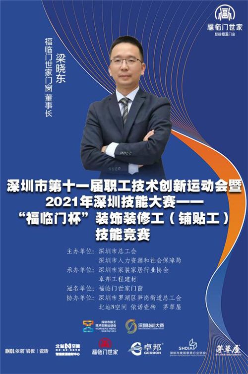 本次大赛是由深圳市总工会、深圳市人力资源和社会保障局共同主办,深圳市家装家居行业协会和深圳市卓邦工程建筑材料有限公司共同承办,由广东福临门世家智能家居有限公司冠名,由深圳市罗湖区笋岗街道总工会、北站N空间、虹运辅材、依诺瓷砖岩板和茅草屋建材报共同协办。