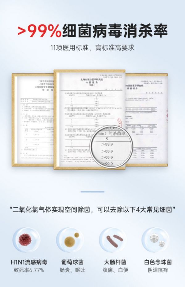 加护灵,由日本大幸药品研发的室内空间除菌剂,主要成分是二氧化氯。二氧化氯是国际公认的广谱高效氧化性消毒剂,除了用在饮用水消毒、医学消毒等领域,还被用在航空食品消毒等多个领域。符合浓度标准的的二氧化氯不仅消毒能力极强,而且对人体无毒无害。其独家专利的缓释技术可以保持长期稳定释放二氧化氯气体,通过二氧化氯破坏流感病毒体内蛋白质的酪氨酸,使病毒失去活性,来阻止病毒对人体细胞接触,以此来达到室内消毒除菌的目的。