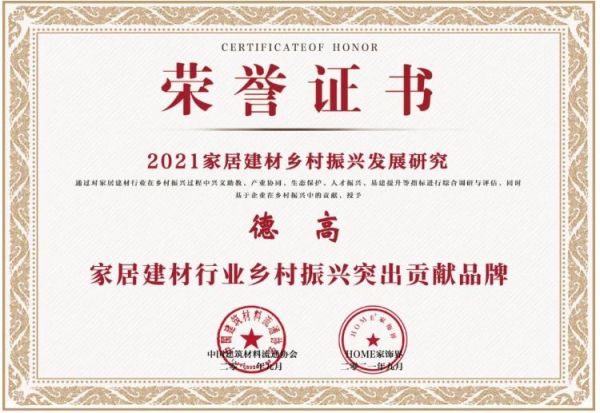 近日,由HOME家饰界、中国建筑材料流通协会主办的“乡村振兴先行者 时代进步践行家——2021中国家居建材行业乡村振兴发展报告”重磅发布。凭借在乡村振兴过程中,兴文助教、产业协同、生态保护、人才振兴、基建提升方面的亮眼表现,西卡德高喜获“家居建材行业乡村振兴突出贡献品牌”荣誉。