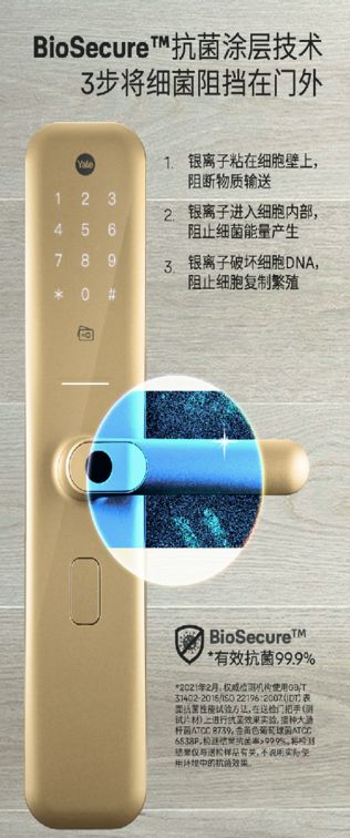 耶鲁将亚萨合莱集团新研发的BioSecureTM抗菌涂层技术运用到Helios S上,在不影响手感和外观的基础上,涂层上的银离子可粘在细胞壁上阻断物质输送,进入细胞内部组织细菌能力产生、 破坏细胞DNA纺织细胞复制繁殖,实现“3步抗菌”。