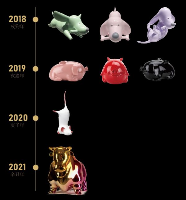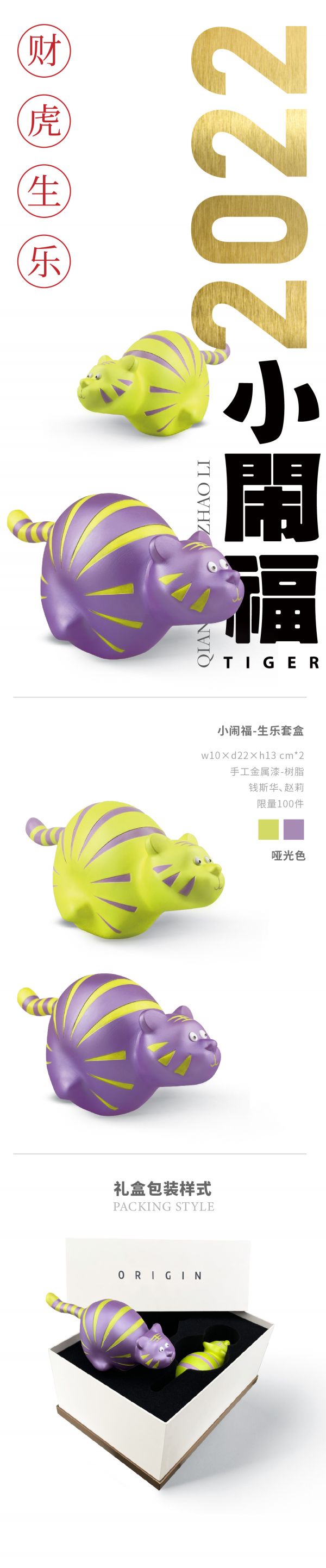 2022年,农历壬寅虎年,好事常在,财禄不缺。虎为十二生肖之一,排行第三,中国虎文化渊远流长,虎也一直是代表除灾免祸的镇邪物和趋吉避邪的吉祥物,在当下更具有向往和勇敢追求幸福美好事物的象征意义。钱老师与赵老师在创作初期也是在收集参考了国内外大量有关虎的形象资料基础上设计完成。两位老师都认为“虎”,在东亚文化观念中是镇宅辟邪的神物,传统表现突出于凶猛特点。而作为物间生肖雕塑创作的特色风格延续,以当代的art toys的审美品味并兼顾于传统的寓意,镇宅辟邪的基础上加入可爱、活泼、灵动的元素,并且“虎”也离不开纹样的表现。在雕塑表面形态增加了凹凸变化,颜色选择奇幻浪漫的氛围。