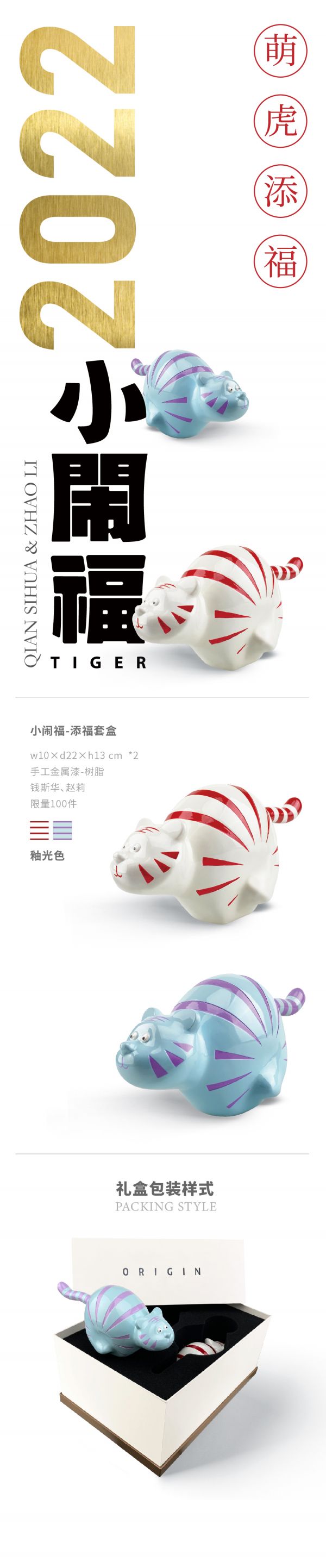 物间与钱斯华和赵老师的合作走入第五个年头,从“汪汪有财”的2018年、“猪”光“榴”影的2019年,“鼠到福来”的2020年,“牛转钱坤”的2021年,不知不觉我们已经度过这么多有趣的时光,在与两位老师的沟通中,怎样赋予2022年“虎”象征的内容及意义,解读“虎”的艺术形态与再创造,从文创礼品的角度来创作,我们认为意义上更加深远。“小闹福”源自于孩童说话时萌生萌气的俏皮话,方言“虎”、“福”谐音,“闹”也代表着一切⽣机勃勃。小闹福系列的形态表达着勇敢向前,萌态可掬,也是在寅虎年到来之际传达着寅⻁闹福,意趣无穷。