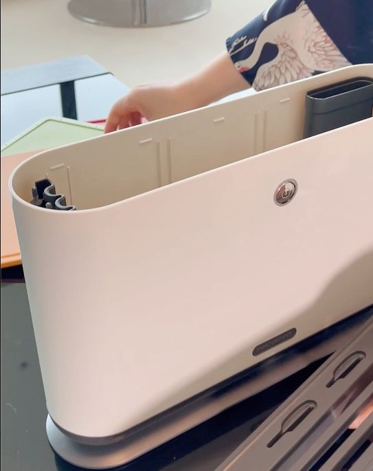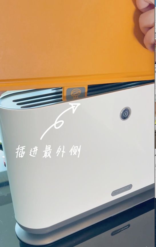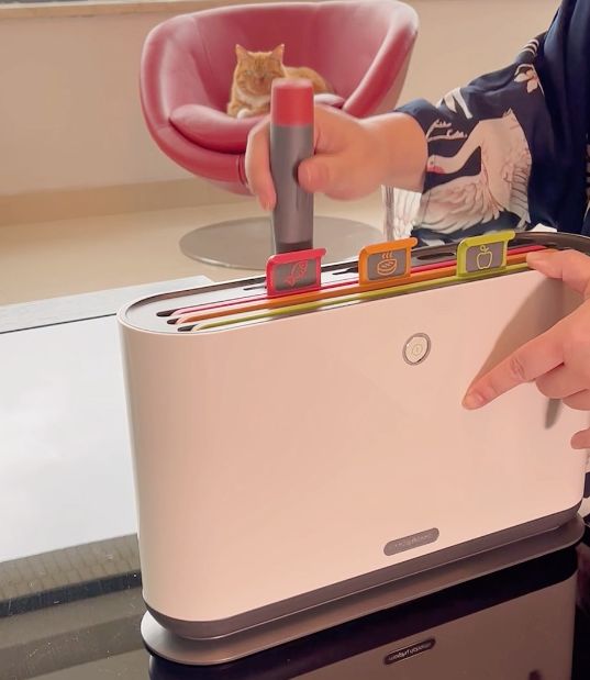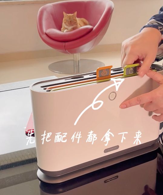 摩飞的每面砧板都会自带一个分类标签把手,用于区分生鲜、熟食和果蔬。只需要把砧板翻转过来,将标签把手放进上盖外侧的凹槽空隙,使标签扣住上盖内侧边缘。固定好消毒机后,轻轻用力向上提砧板,就能用巧劲打开上盖。