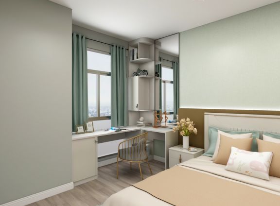 对于墙和墙之间的凹位,放什么尺寸的家具都会比较尴尬,所以在这里可以定制一个嵌入式书桌柜组合,既能完美化解墙面凹位的不足,而且还实现了空间的最大化利用,实用又美观。