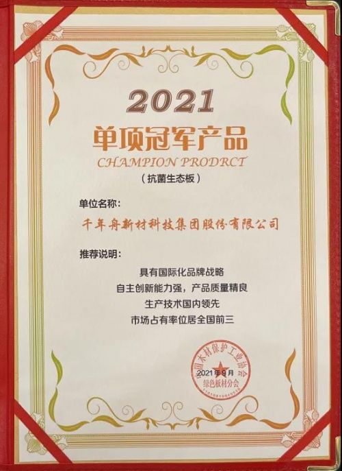 荣耀加身!千年舟抗菌生态板斩获第十三届中国木材保护大会单项冠军产品