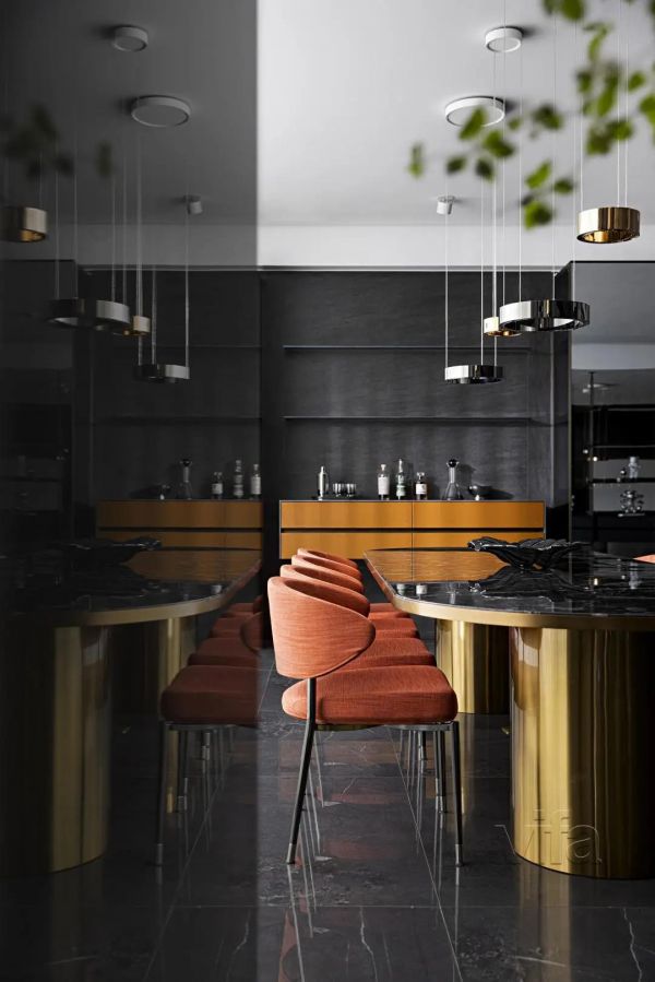 展台上的雕塑与花卉绿植、展架上的名酒与摆台书籍随形就势给视觉一个过渡,让整体空间更加和谐。整体上将结构的力度和装饰的美感巧妙结合,色彩和光影上的连接和过渡也非常流畅自然。