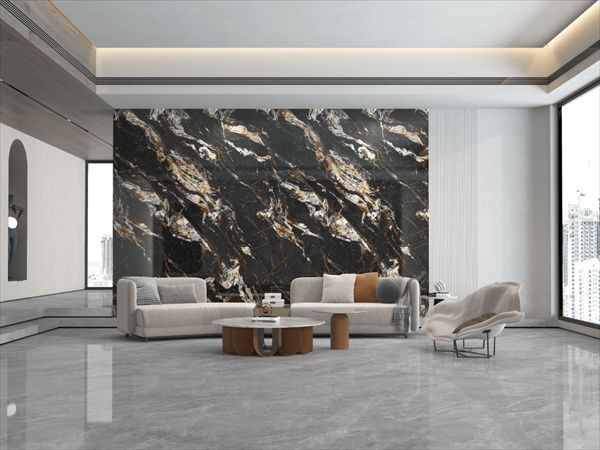混搭风格更能彰显出居住者的独特个性,墙面背景选用星系列新品墨舞沉香,乳白色带状图案和金色细纹交织相融,在墨黑色的砖面上奔涌,宛如一幅精美绝伦的水墨画;地面选用云系列新品帕萨特,灵感取自珍稀石材,团流状纹理张扬大气,打造高品质、高格调的生活气韵。