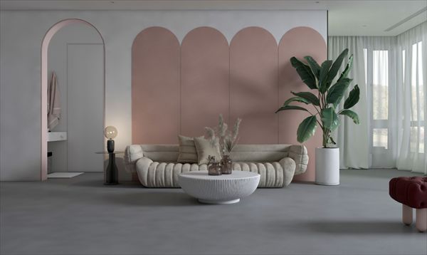 大面积色块拼接为空间增添鲜明的层次感,墙面选用华系列新品樱花粉作装饰,柔美清新的樱花粉色与白色墙面巧妙碰撞,营造出梦幻美感;地面选用月光石灰,简约百搭,营造柔和舒雅的家居氛围。