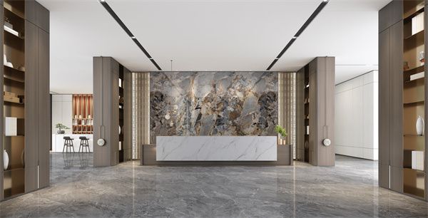 颜色层次丰富的背景墙一眼就成为空间亮点,背景墙选用将神话传说与现代元素融合创新,打造黑、白、灰、蓝、金色交织绚烂的星系列新品盘古麟石,赋予空间古朴苍茫、大气恢弘的意境情韵。