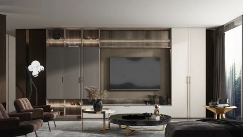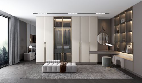并且,在衣帽间的设计中,超高门衣柜就采用了立体腰线造型门板,使其外观简洁而又富有动感,尤其是在光影的作用下,呈现出独特的立体感。衣柜拉手则是采用了腰带型的设计,与门板的造型相契合,带来浓浓的浪漫气息。
