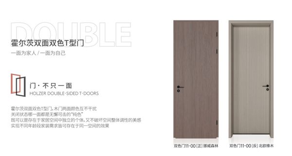 选木门的第二步,当然是看颜值。在这个“审美”多样化的时代,如何满足消费者的个性化风格需求?这就不得不介绍下霍尔茨木门的另一“硬核”技能:创新型材料CPL。CPL材料是目前市场上新型的异型材包覆材料,有阻燃、耐划、耐酸碱、不退色、易保养、环保等特性,表面纹理逼真,可随心所欲定制各种花色。除此之外,霍尔茨木门还打破了传统单色门不能满足两个空间、两种风格需求的行业痛点,推出了双面双色T型门,用双面不同色将两个空间分隔开。双面双色,不仅实现了“一屋一色”,也让木门真正融入了两个空间,使每个空间都有了自己的特点。