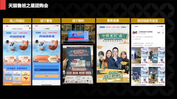 而天猫鲁班之星团购会一方面扩大了宣传面,让活动在淘宝天猫专属页面透出,以到店权益、优惠券等吸引顾客,同时通过短视频、直播等宣发蓄客;另一方面,天猫专门为商家开发了团购小程序,导购可以直接将活动页面转发给客户,客户可以领取电子定金券,或在线报名参团,而导购可通过与报名顾客直接沟通,介绍活动详情并引导其到店购买。