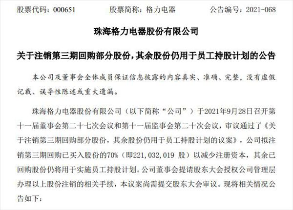 格力电器表示,本次变更第三期部分回购股份用途并注销,是公司结合目前实际情况作出的决策,有利于进一步提升每股收益水平,切实提高公司股东的投资回报。