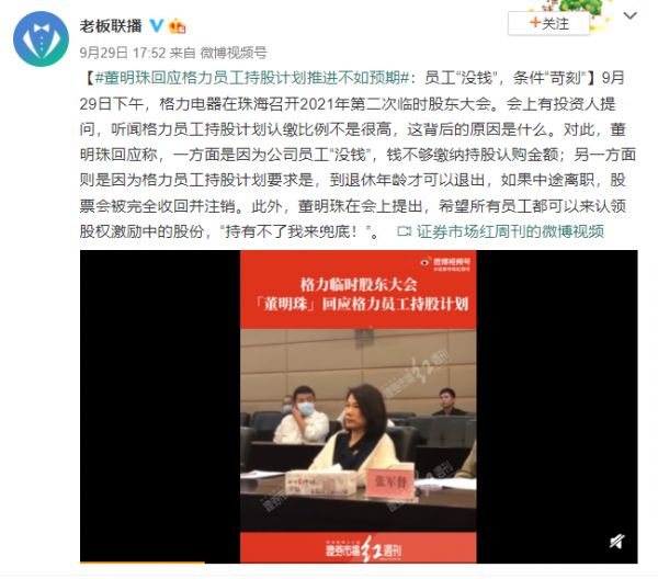 据媒体报道,9月29日下午,格力电器在珠海召开2021年第二次临时股东大会。就格力员工持股计划认缴比例不高一事,董明珠回应,一方面是因为公司员工“没钱”,钱不够缴纳持股认购金额;另一方面则是因为格力员工持股计划要求是,到退休年龄才可以退出,如果中途离职,股票会被完全收回并注销。
