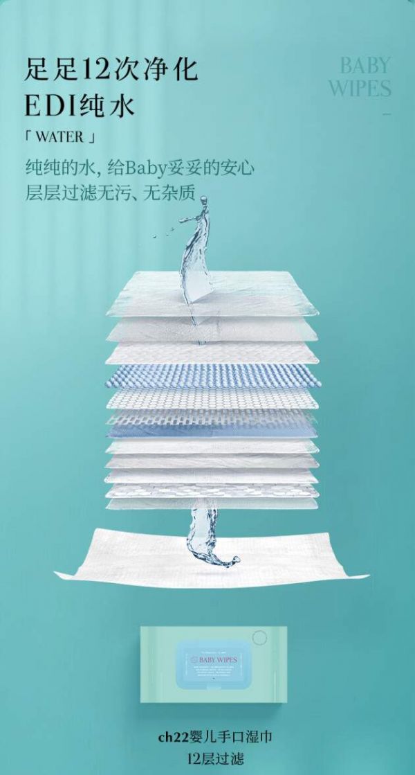 作为湿巾,水是至关重要的元素。尤其是小宝宝们,更加需要安全、干净的清洁体验,一切与肌肤零距离接触的日用品,品质都必须是严要求、高标准的。ch22婴儿手口湿巾,采用经过具备12层过滤处理的EDI纯水设备,产出符合美国FDA标准的医药级用水,比纯净水更为纯净。源于天然而优于天然,只为悉心呵护细嫩肌肤,让妈妈和宝宝们可以放心长期使用。