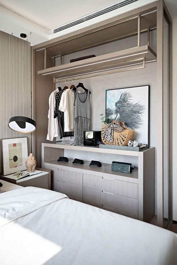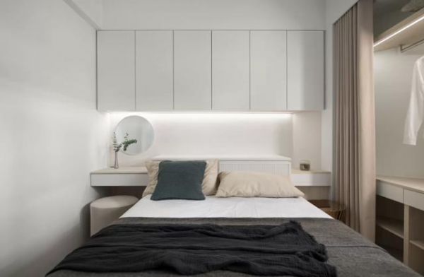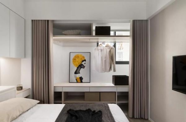 或者直接改个方向,不在窗下打造,而是在靠近卧室内部一侧墙面处打造,去除封闭式到顶柜子千篇一律的设计,换成开放式的存储空间。也可以给下方打上柜子,上方安装衣杆和置物板,足够存放女业主的各种物品,很精致很耐看。