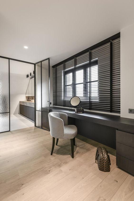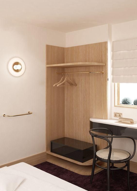 家中的墙面拐角空间也可以利用上,给墙面处安装L型防护板,做装饰的同时防止墙面弄脏保护大白墙,而置物板上还可以往外延伸置物板和挂衣杆,与梳妆台结合,耐看的很!