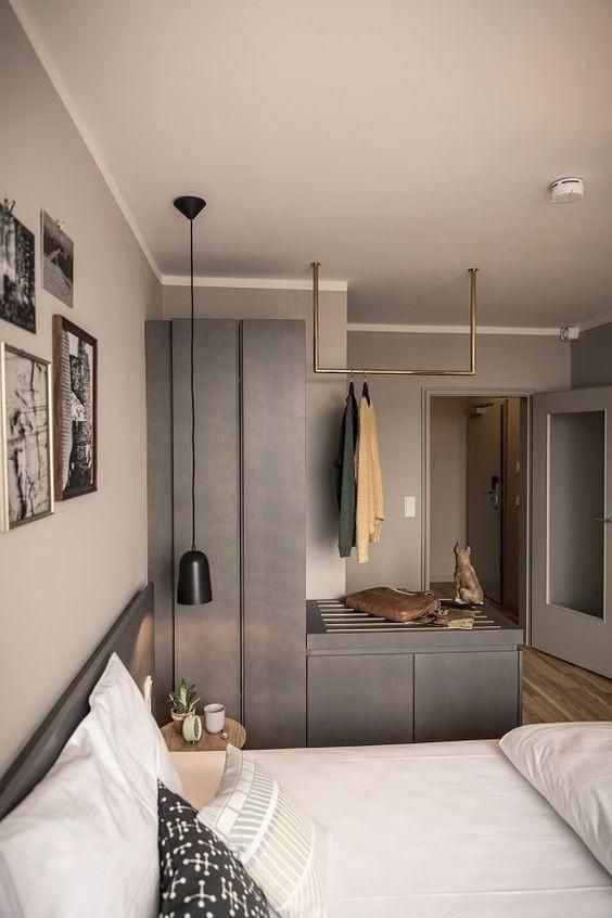 不愿意打造柜子的,可以选择简单的嵌入式布局,安装铁艺置物架和衣杆铁杆,也能满足基本的置物功能,嵌入式设计不占外部走道的空间,非常省地,极简带来美观性。
