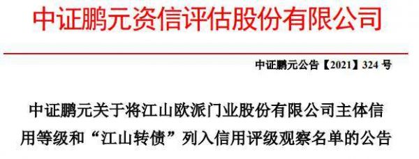 10月7日,江山欧派(603208.SH)发布公告,公司对恒大地产的应收款项规模较大,回收存在较大不确定性,可能对公司盈利水平产生较大不利影响。中证鹏元资信评估股份有限公司(简称“中证鹏元”)决定将公司主体信用等级及“江山转债”列入信用评级观察名单。
