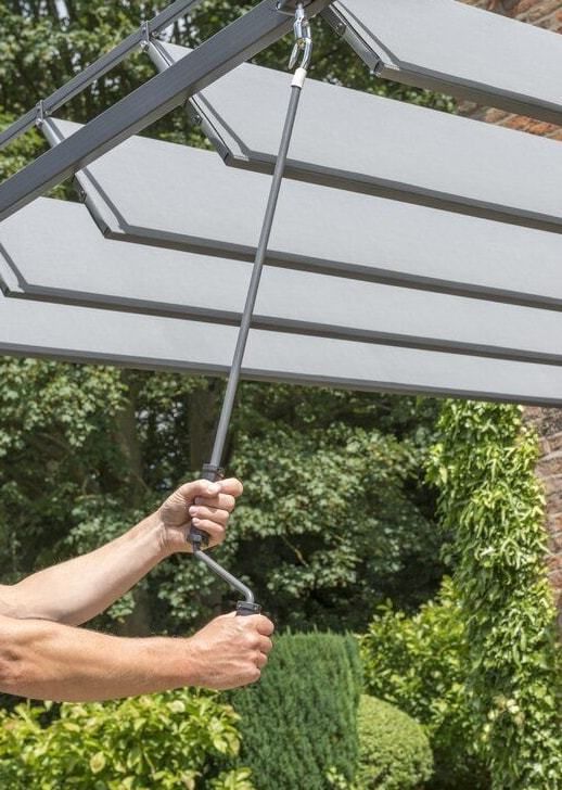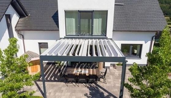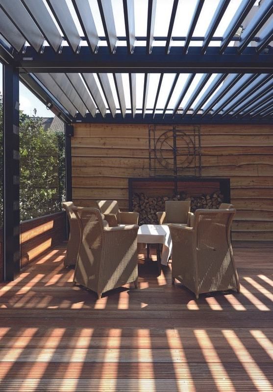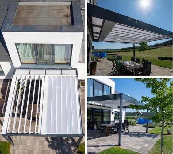 这种院子遮阳方式,也在现在慢慢流行起来,它叫“百叶窗式顶部遮阳”,相比一般的廊架、阳光房,更推荐这种遮阳方式。
