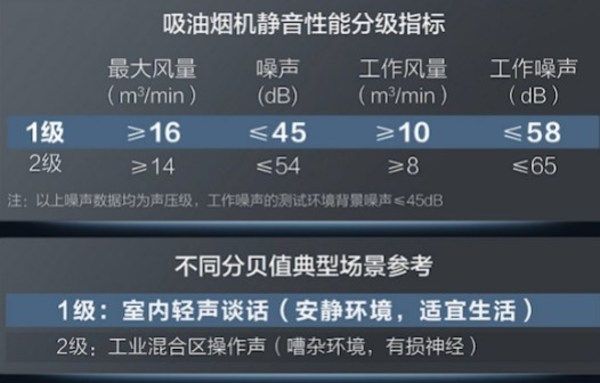 中国五金制品协会权威发布《吸油烟机静音分级评价规范》团体标准:在现有国标对油烟机噪声的评价体系上,用科学的方法和严谨的指标,从“自身噪声”和“使用噪声”两大维度来对机器的噪声水平进行了专业评级,以1级静音和2级静音标准划分来定义静音型油烟机的等级。